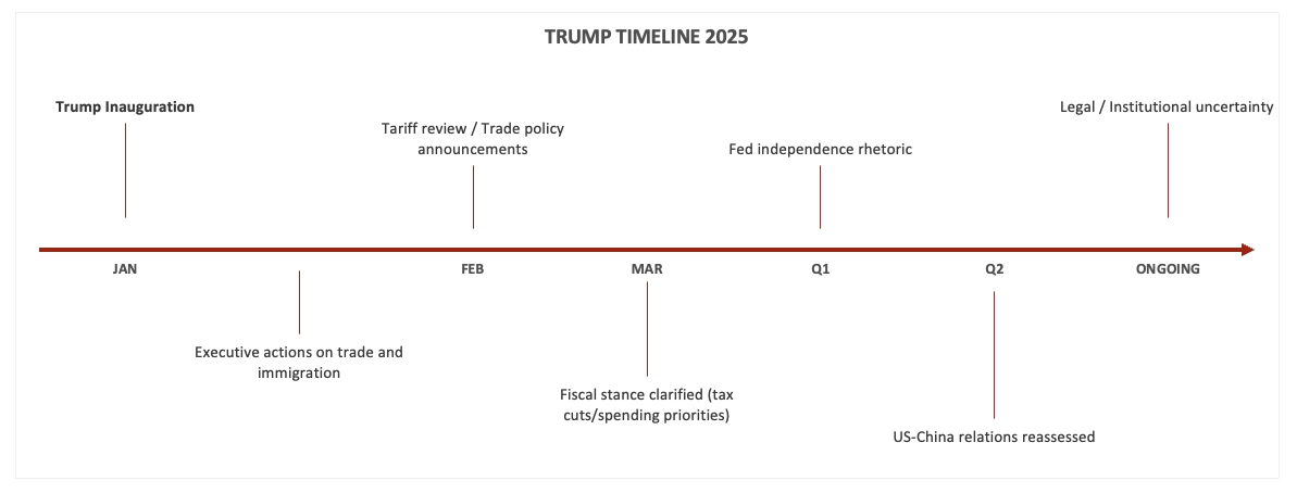 Và rồi có yếu tố Trump: Chính trị đã ít quan trọng hơn như một động lực hướng đi rõ ràng cho đồng đô la và nhiều hơn như một nguồn biến động lặp đi lặp lại. Như thời gian biểu dưới đây cho thấy, các giai đoạn không chắc chắn về chính sách hoặc địa chính trị gia tăng thường là những khoảnh khắc mà đồng tiền này được hưởng lợi từ vai trò trú ẩn an toàn của nó.