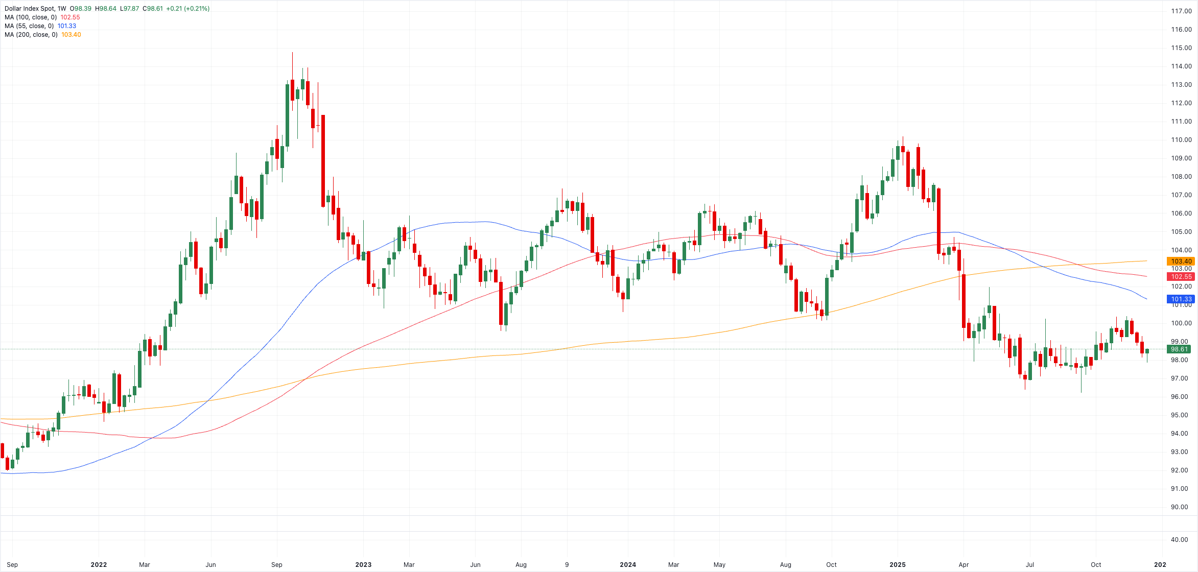 Từ góc độ kỹ thuật, sự thoái lui gần đây của đồng đô la vẫn trông giống như một sự tạm dừng trong một phạm vi rộng hơn hơn là sự khởi đầu của một sự đảo ngược xu hướng quyết định, ít nhất là khi nhìn qua lăng kính của Chỉ số đô la Mỹ. Lùi lại một chút để xem biểu đồ hàng tuần và hàng tháng, bức tranh trở nên rõ ràng hơn: DXY vẫn thoải mái trên mức trước đại dịch, với người mua tiếp tục xuất hiện mỗi khi căng thẳng quay trở lại hệ thống.