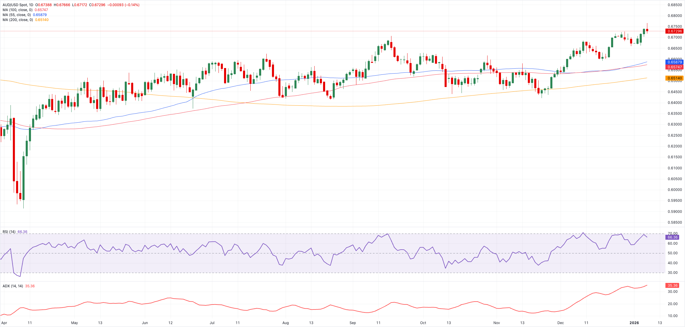 Đồng đô la Úc (AUD) chịu áp lực mới vào thứ Tư, với tỷ giá AUD/USD giảm từ mức cao nhất 15 tháng quanh mức 0.6760 xuống vùng 0.6720. Ngoài ra, cặp tỷ giá này đã chấm dứt ba ngày tăng liên tiếp, mặc dù vẫn duy trì khởi đầu vững chắc trong năm mới.