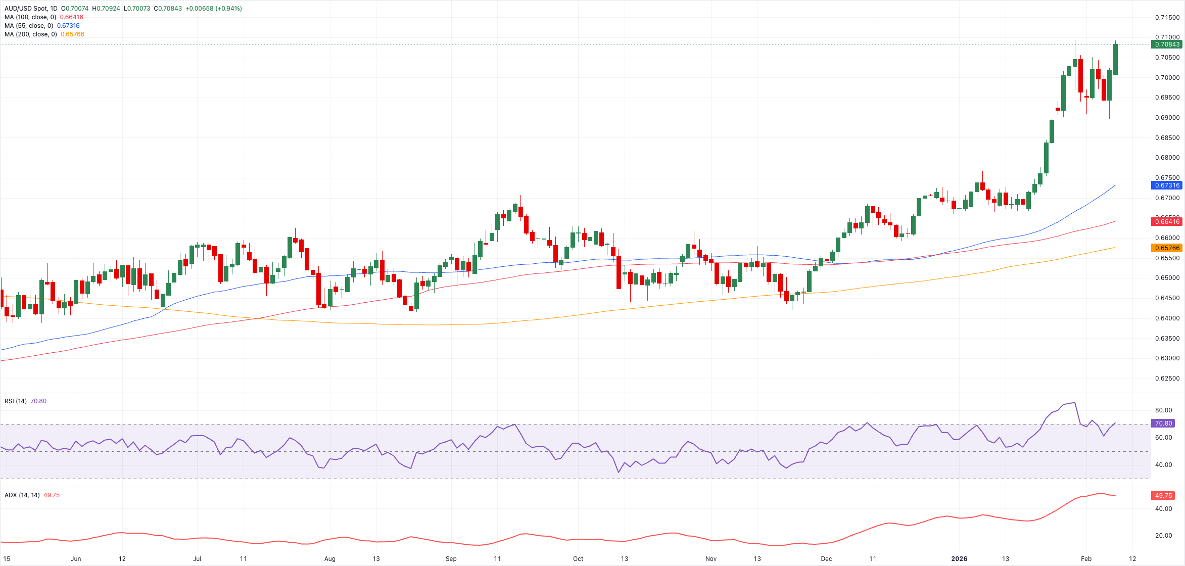 - AUD/USD đạt mức cao nhất hàng năm mới, chỉ còn vài pip nữa là chạm ngưỡng 0,7100.