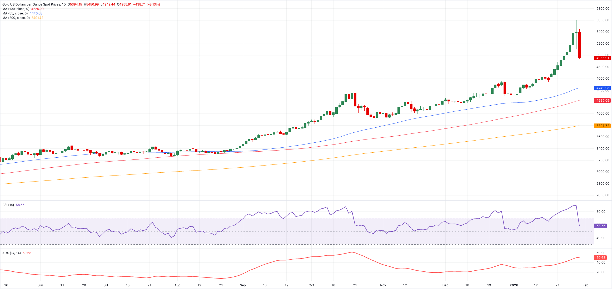 Đà tăng giá của vàng (XAU/USD) đã đột ngột dừng lại vào thứ Năm. Kim loại quý này đã giảm gần 10% trong vòng chưa đầy 24 giờ và đang giao dịch quanh mức 5.080 USD tại thời điểm viết bài, với mức tâm lý 5.000 USD ở rất gần.