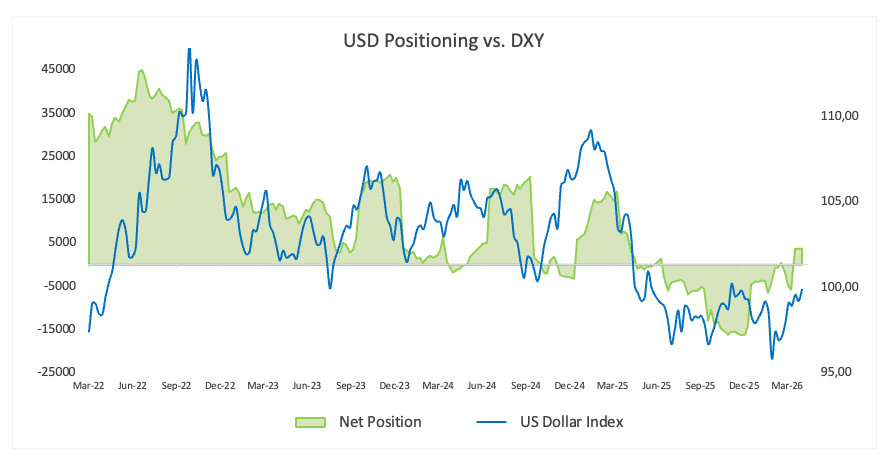 Câu chuyện định vị đầu cơ đồng Đô la Mỹ vẫn là sự tái xây dựng dần dần hơn là một sự chuyển dịch mạnh mẽ. Sau khi chuyển từ vị thế bán ròng nhỏ sang vị thế mua ròng khiêm tốn vào đầu tháng, định vị đã ổn định, giữ quanh mức 3,6K–3,7K hợp đồng gần đây, theo Ủy ban Giao dịch Hàng hóa Tương lai (CFTC).