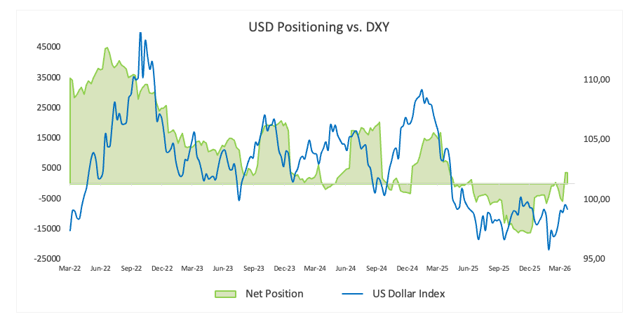 Điều này ngụ ý rằng đồng Đô la có thể đang ở giai đoạn đầu của việc tái xây dựng vị thế rộng hơn. Mặc dù vị thế chưa bị đẩy lên mức quá mức, xu hướng hiện tại củng cố hành động giá tăng gần đây và cho thấy các đợt giảm có thể bắt đầu thu hút người mua một cách nhất quán hơn, đặc biệt nếu lợi suất được duy trì và tâm lý rủi ro vẫn mong manh.