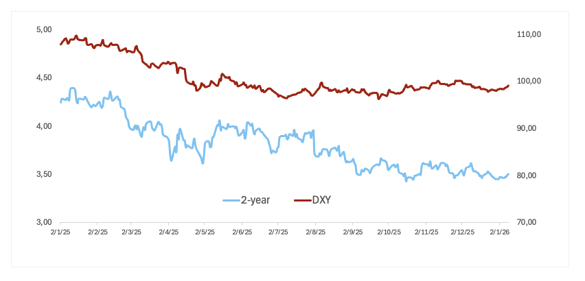 Đà tăng hàng tuần của đồng bạc xanh chỉ đi kèm với sự phục hồi vững chắc tương tự trong lợi suất trái phiếu chính phủ Mỹ kỳ hạn 2 năm, trong khi phần giữa và phần dài của đường cong đã giảm nhẹ trong khoảng thời gian đó.