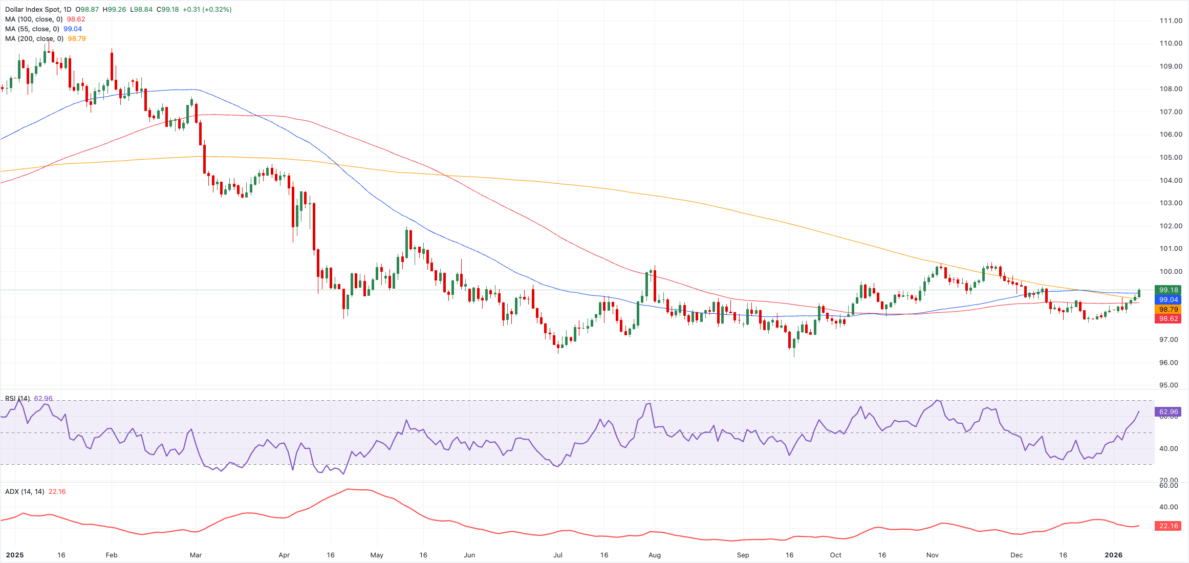 Kể từ khi chạm đáy gần 97,70 vào ngày 24 tháng 12, Chỉ số Đô la Mỹ (DXY) đã bắt đầu một đợt phục hồi vững chắc không chỉ lấy lại rào cản 99,00 mà còn bỏ lại đường SMA 200 ngày quan trọng quanh mức 98,80.