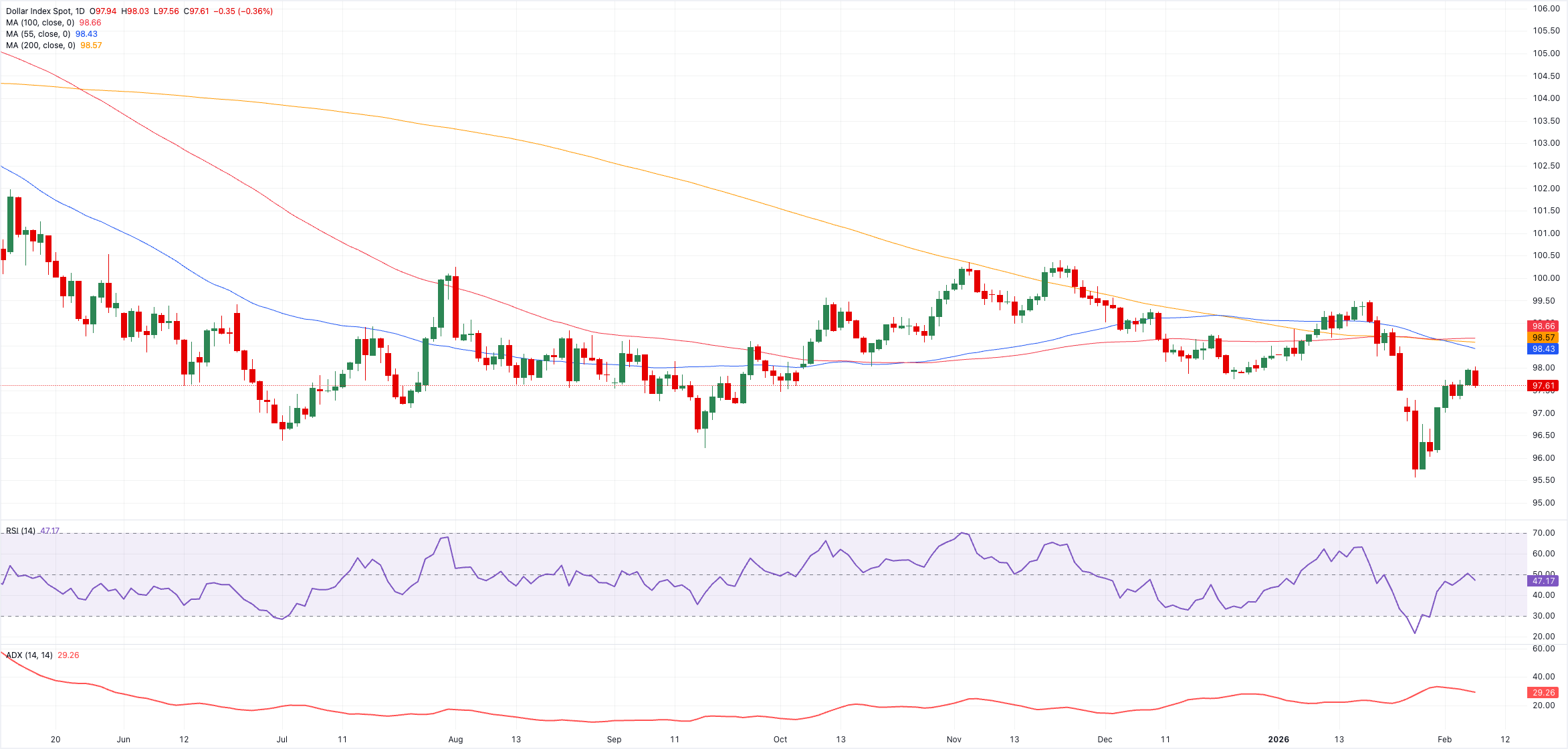 Khi chỉ số vượt qua khu vực này, nó có thể cố gắng kiểm tra băng 98,50-98,70, nơi mà các đường SMA 55 ngày và 100 ngày tạm thời và đường SMA 200 ngày có liên quan đều hội tụ. Phía bắc ở đây là mức trần 2026 tại 99,49 (ngày 15 tháng 1).