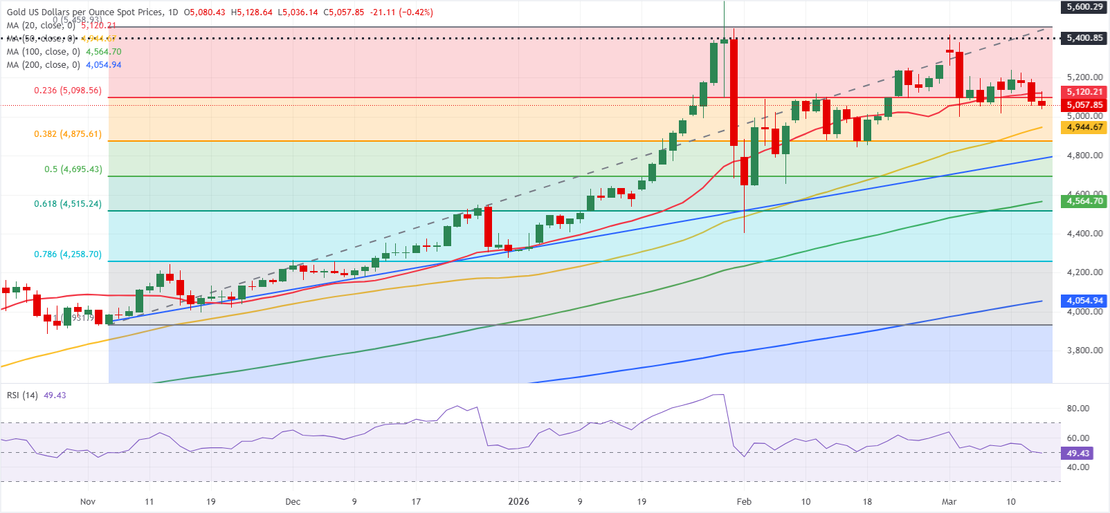 Mức Fibonacci 23,6% retracement của xu hướng tăng từ tháng 11 đến tháng 2 và SMA 20 ngày tạo thành một khu vực pivot tại 5.100$-5.120$. Nếu Vàng duy trì dưới khu vực này và xác nhận nó là mức kháng cự, người mua có thể đứng ngoài. Nhìn về phía nam, mức hỗ trợ đầu tiên có thể được phát hiện tại 4.945$ (SMA 50 ngày), trước 4.875$ (mức Fibonacci 38,2% retracement) và đường xu hướng tăng tại 4.800$.
