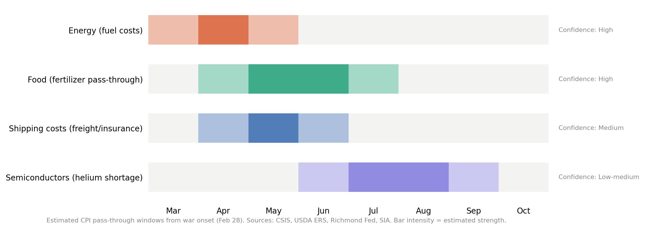 Đường ống PPI-CPI luôn bị rò rỉ dưới điều kiện bình thường. Điều làm cho môi trường hiện tại khác biệt là các nhà sản xuất không phải đối mặt với một cú sốc chi phí đơn kênh. Họ đang bị tác động từ ít nhất bốn hướng cùng lúc, và chiến tranh ở Iran là nguyên nhân chính của hầu hết các cú sốc đó.