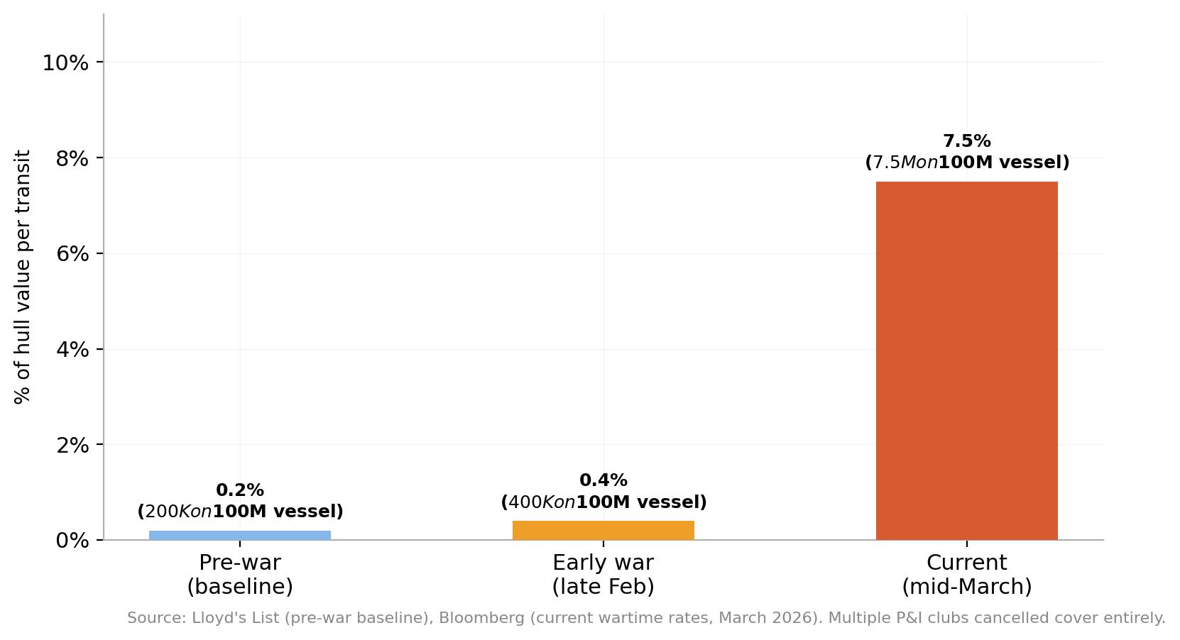 Chi phí vận chuyển đã tăng vọt. Phí bảo hiểm rủi ro chiến tranh cho các tàu đi qua Eo biển Hormuz đã tăng từ khoảng 0,15% đến 0,25% giá trị thân tàu trước xung đột lên tới 5% đến 10%, theo Lloyd's List. Đối với một tàu chở dầu lớn trị giá 100 triệu đô la, điều này tương đương với 5 triệu đô la chi phí bảo hiểm cho một chuyến đi. Hapag-Lloyd đã áp dụng phụ phí rủi ro chiến tranh lên đến 3.500$ cho mỗi container kể từ ngày 2 tháng 3.