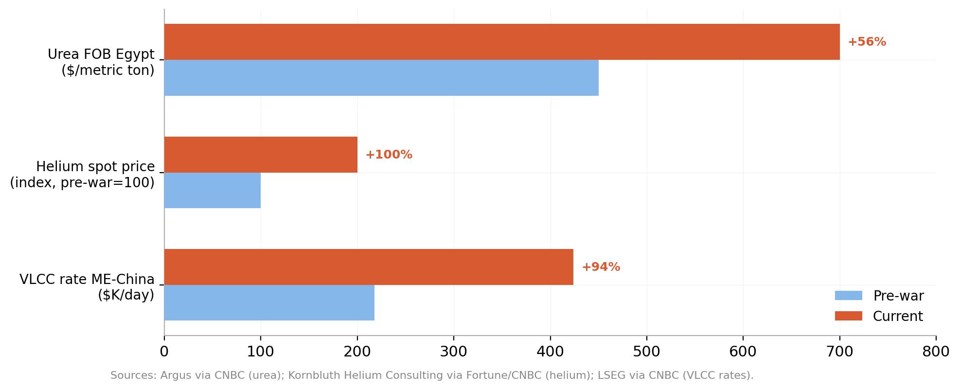Và rồi thị trường phân bón bùng nổ. Gần một nửa lượng urê giao dịch toàn cầu và khoảng 30% xuất khẩu amoniac đến từ các quốc gia Vùng Vịnh có hàng hóa vận chuyển qua Eo biển Hormuz. Với việc Eo biển này gần như đóng cửa từ đầu tháng 3, giá urê đã tăng từ khoảng 450$ mỗi tấn trước khi tên lửa bắt đầu bay lên đến khoảng 700$, tăng khoảng 45% chỉ trong vài tuần.