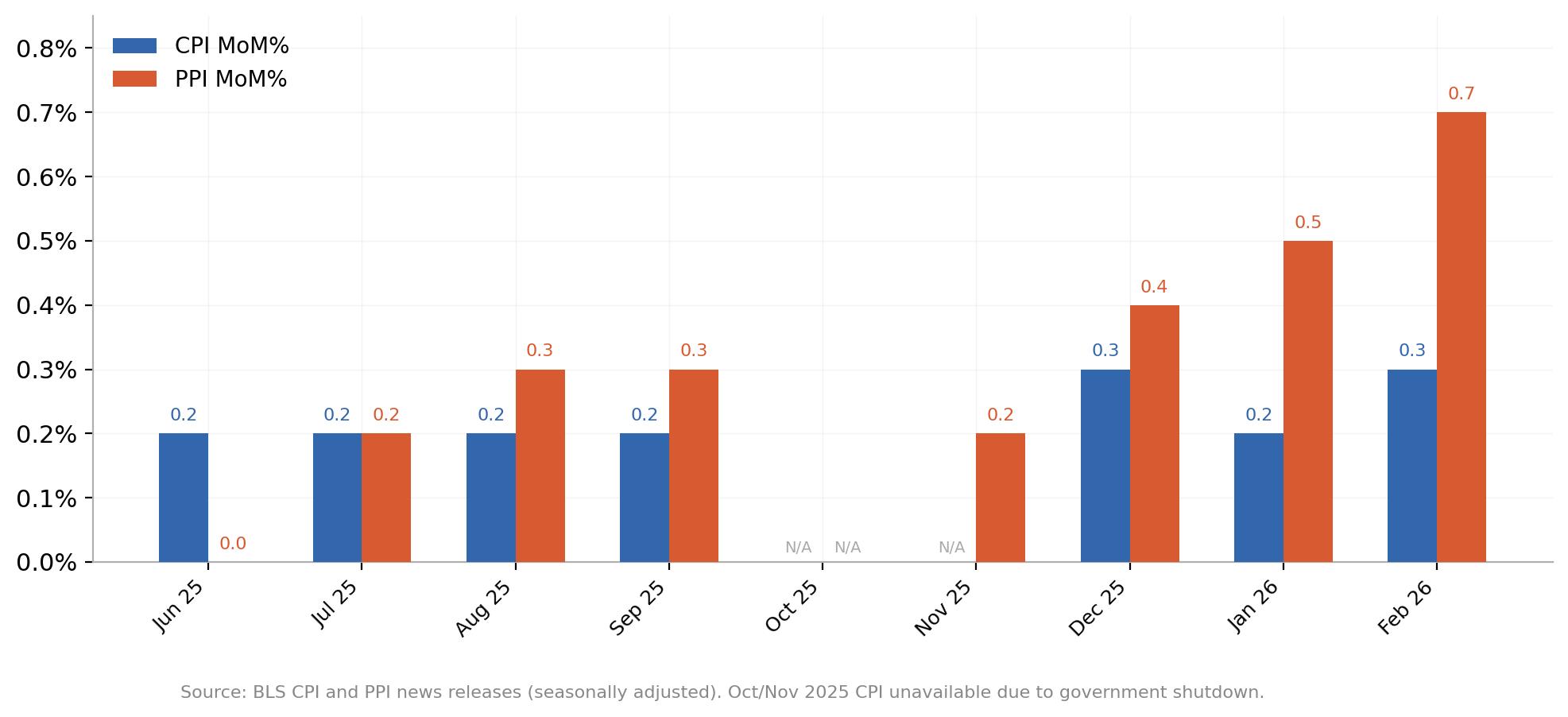 Đến năm 2024, hai chỉ số hội tụ vào phạm vi tương tự, không bên nào rõ ràng dẫn dắt bên kia. Điều đó không kéo dài. Trong suốt năm 2025, PPI duy trì mức chênh lệch bền vững so với CPI, rồi đến cuối năm tăng tốc: các chỉ số PPI hàng tháng tăng nhanh qua tháng 2, trong khi CPI vẫn giữ quanh mức 0,2%-0,3%. Khoảng cách lại xuất hiện, rồi cuộc chiến bắt đầu.