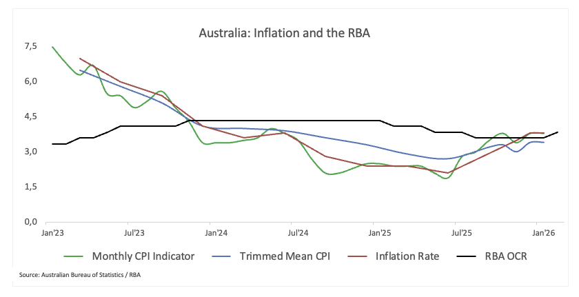 Dữ liệu lạm phát tháng 1 một lần nữa nhắc nhở thị trường rằng áp lực giá cả không giảm nhanh chóng. Thực tế, chỉ số giá tiêu dùng (CPI) toàn phần giữ ở mức 3,8% so với cùng kỳ năm trước trong tháng thứ hai liên tiếp, cao hơn một chút so với mức đồng thuận 3,7%. Quan trọng hơn, chỉ số trung bình cắt giảm, thước đo cốt lõi ưa thích của RBA, đã tăng lên 3,4% so với cùng kỳ năm trước từ mức 3,3%.