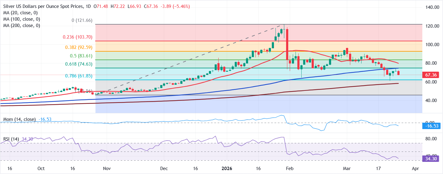 Mức thấp gần đây ở 61$ cung cấp hỗ trợ ngay lập tức trước SMA 200 ngày ở khoảng 58$. Khi mức này bị phá vỡ, Bạc có khả năng hoàn thành mức thoái lui 100% và trượt xuống mức 46$. Việc phục hồi vượt qua 75$ không đảm bảo sự trở lại mức cao kỷ lục. Cặp XAG/USD sẽ đối mặt với rào cản tiếp theo của người bán ở khoảng 83,60$, trong khi các mức tăng tiếp theo có thể bị giới hạn bởi mức thoái lui Fibonacci 38,2% tại 92,60$.