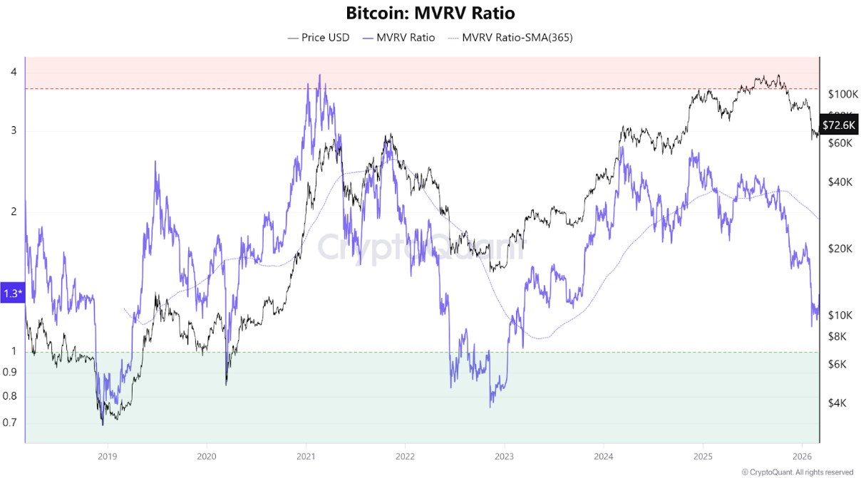 Một số chỉ số định giá từ CryptoQuant cung cấp cái nhìn rõ ràng hơn về điều này. Ví dụ, tỷ lệ Giá trị Thị trường so với Giá trị Thực hiện (MVRV) hiện ở mức 1,3, nằm ngoài khu vực bị định giá cực thấp (được đánh dấu bằng màu xanh lá cây trong biểu đồ dưới đây), nơi mà lịch sử cho thấy các đáy thị trường đã hình thành.