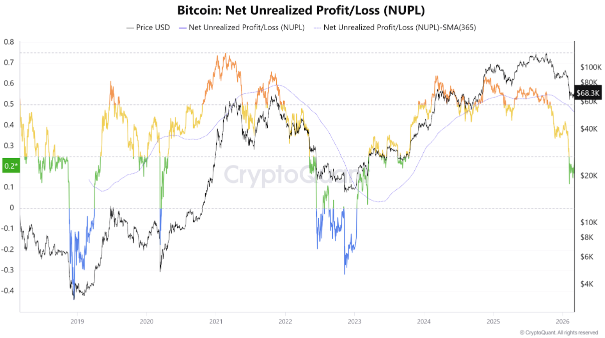 Tương tự, biểu đồ Lợi nhuận/Lỗ chưa thực hiện Ròng (NUPL), một thước đo về biên lợi nhuận/lỗ của các nhà nắm giữ BTC, vẫn cao hơn nhiều so với khu vực bị định giá cực thấp (đường màu xanh) và đang có xu hướng giảm.
