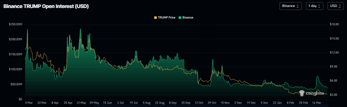 Về phía phái sinh, các số liệu cho thấy xu hướng giảm giá. Khối lượng giao dịch mở của hợp đồng tương lai TRUMP trên sàn Binance giảm xuống còn 39,22 triệu đô la vào thứ Sáu và đã liên tục giảm kể từ giữa tháng 3. Sự sụt giảm OI này phản ánh sự tham gia của nhà đầu tư đang giảm dần.