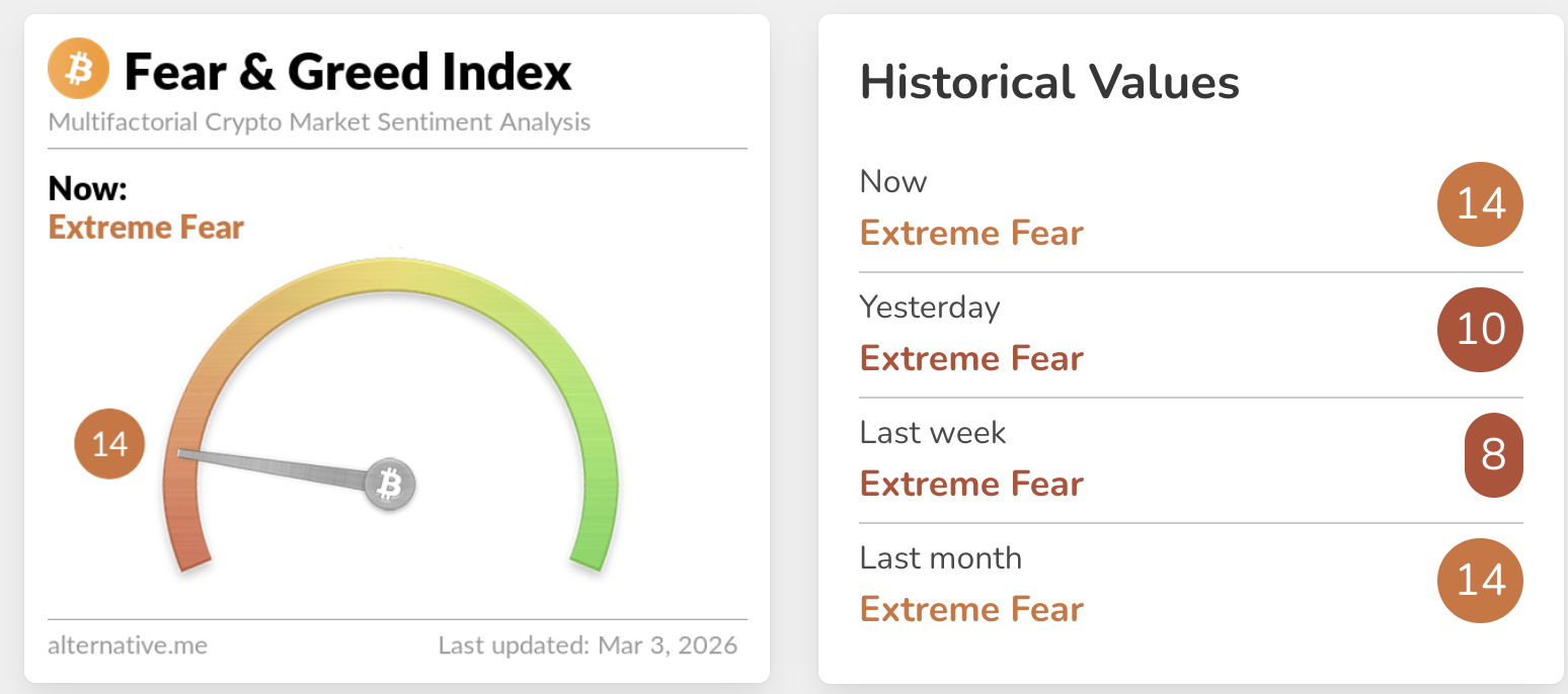 Chỉ số Sợ hãi & Tham lam của Crypto vẫn ở trong tâm lý sợ hãi cực độ. Dữ liệu thay thế cho thấy các nhà đầu tư đã lo sợ từ đầu tháng Hai. Khi các nhà đầu tư tìm nơi trú ẩn bên lề, thanh khoản thấp hạn chế khả năng phục hồi bền vững.