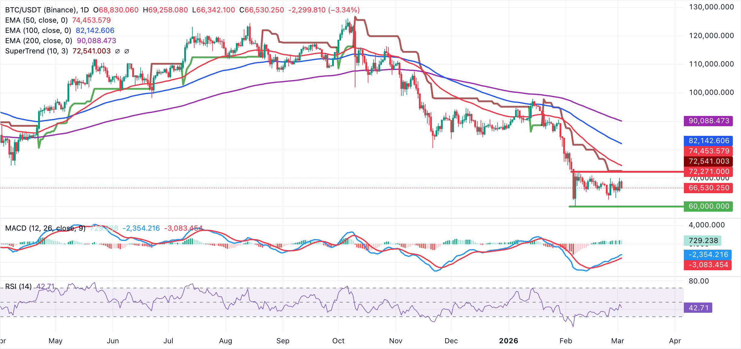 Bitcoin đang giao dịch trên 66.000$ khi giá tiền điện tử điều chỉnh. Xu hướng ngắn hạn chủ yếu là giảm giá khi giá của nó giữ tốt dưới đường SuperTrend gần 72.540$. Tất cả ba đường trung bình động hàm mũ (EMA) áp dụng đều duy trì xu hướng giảm áp lực từ trên.