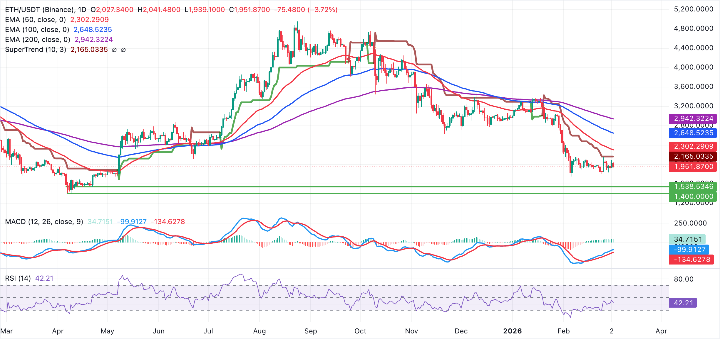 Ethereum cũng đang giao dịch trong bối cảnh áp lực bán gia tăng, ngồi tốt dưới các đường EMA 50 ngày, 100 ngày và 200 ngày đang dốc xuống. Tất cả ba đường trung bình động đều tập trung giữa 2.302$ và 2.942$, định hình triển vọng của ETH trong một bối cảnh điều chỉnh rộng hơn.