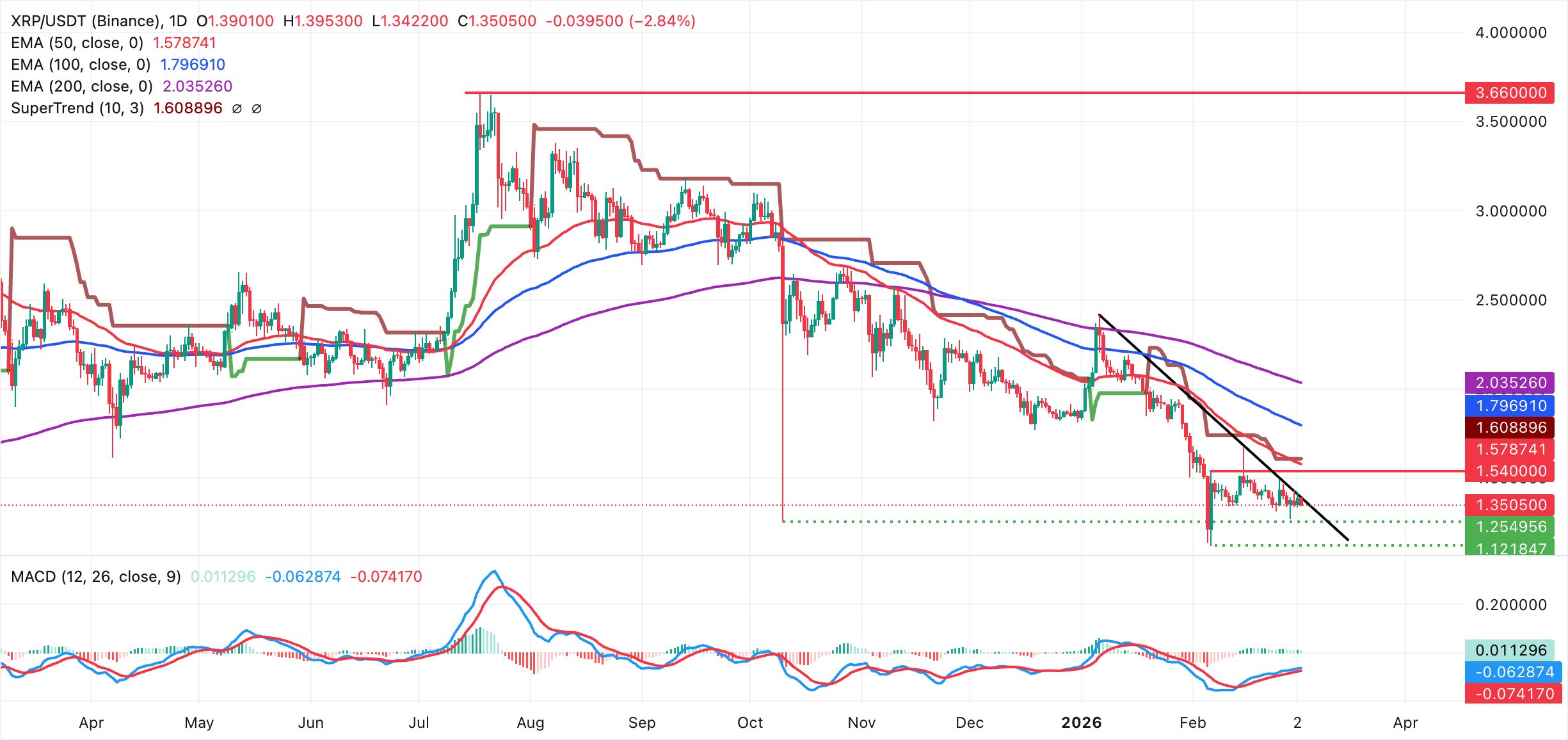 XRP đang trượt xuống còn 1,35$ trong bối cảnh triển vọng chủ yếu là giảm giá được củng cố bởi các đường EMA 50 ngày, 100 ngày và 200 ngày đang dốc xuống, tập trung giữa 1,58$ và 2,05$. Token chuyển tiền đã mất động lực tăng quanh mức 1,42$ vào thứ Hai, bị ảnh hưởng bởi việc chốt lời và tâm lý ngại rủi ro.