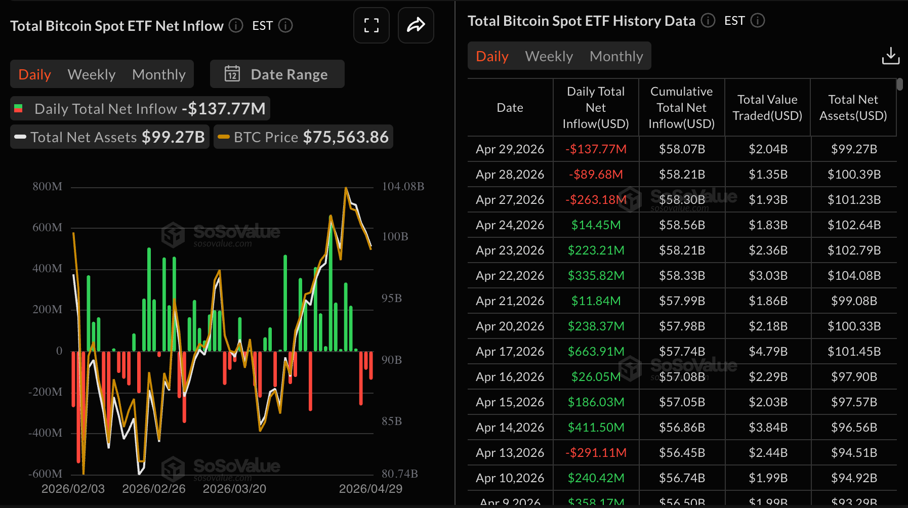 Dòng vốn tích lũy hiện ở mức 58,07 tỷ $, với tài sản ròng dưới quản lý trung bình là 99,27 tỷ $, theo SoSoValue.