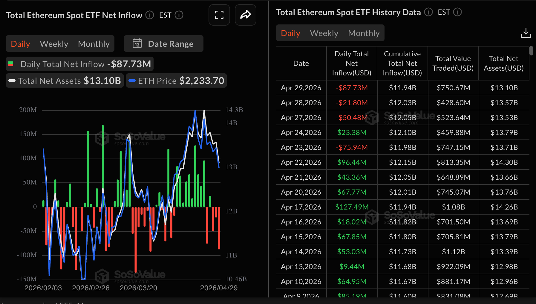 ETF giao ngay Ethereum cũng trải qua ngày thứ ba liên tiếp dòng vốn chảy ra tổng cộng 88 triệu $ vào thứ Tư. Dữ liệu SoSoValue cho thấy các nhà đầu tư rút khoảng 50 triệu $ vào thứ Hai và gần 22 triệu $ vào thứ Ba. Dòng vốn tích lũy ở mức 11,94 tỷ $, với tài sản dưới quản lý tổng cộng 13,10 tỷ $.