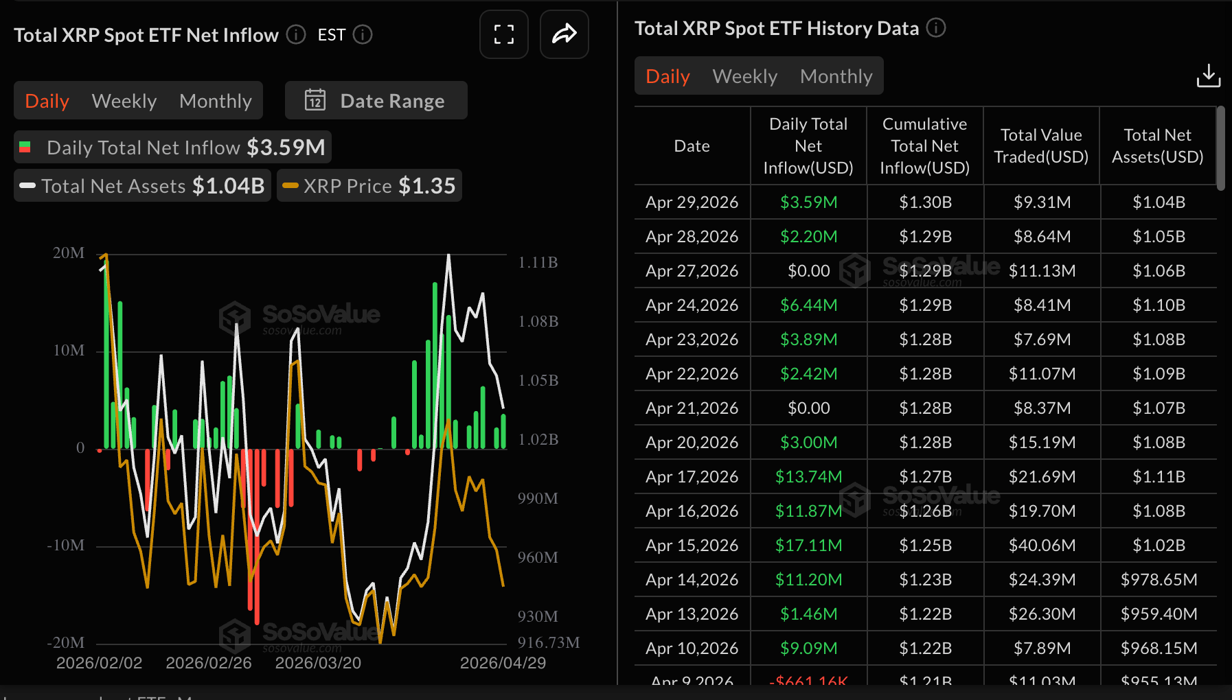 ETF giao ngay XRP, ngược lại, đã vượt qua dự đoán để ghi nhận dòng tiền vào nhẹ là 3,59 triệu $ vào thứ Tư, tăng từ 2,20 triệu $ được ghi nhận vào thứ Ba. Tổng dòng tiền vào hiện đạt 1,30 tỷ $, với tài sản ròng dưới quản lý trung bình là 1,04 tỷ $.