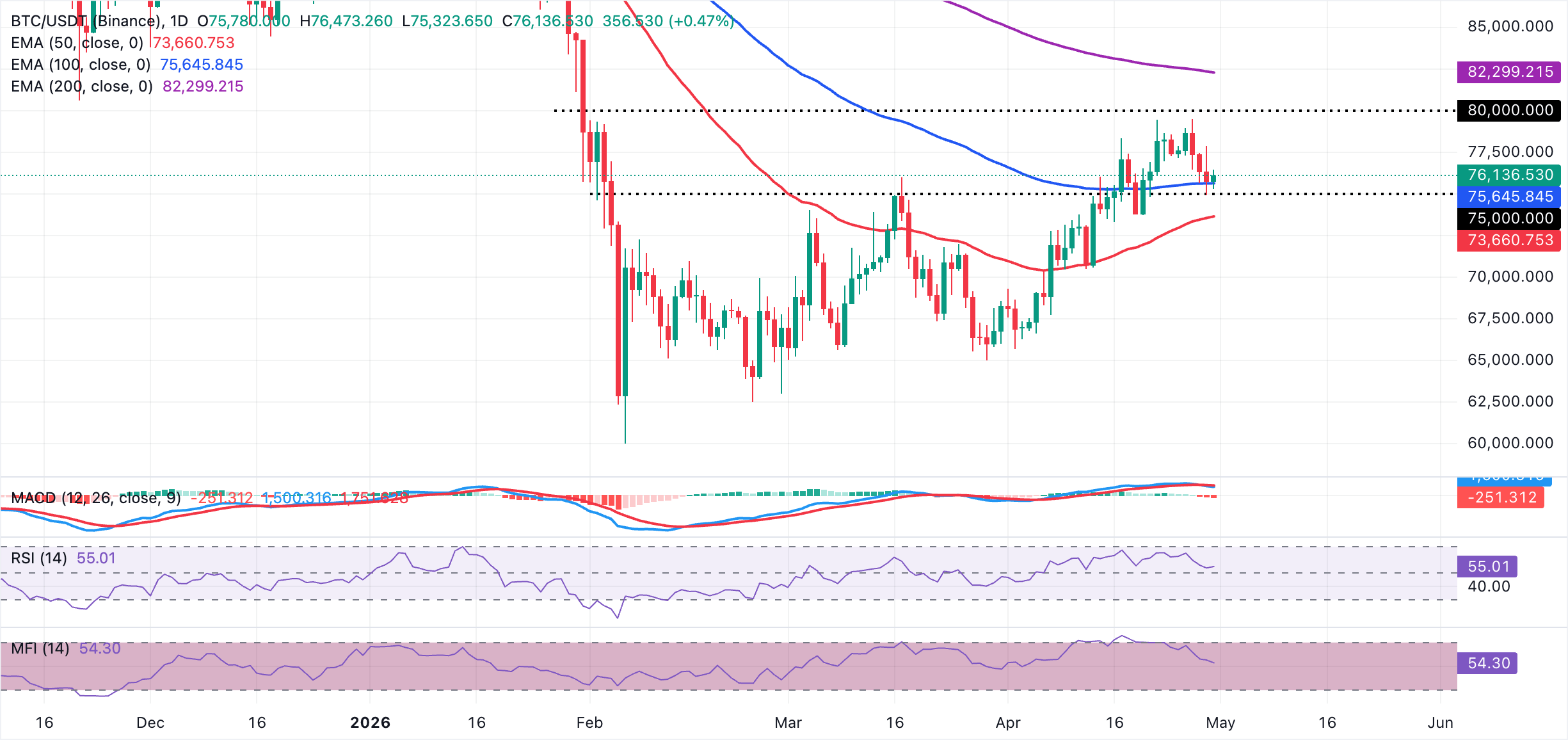 Ở phía trên, mức cao hàng tuần tại 79.486$ và EMA 200 ngày khoảng 82.299$ là các mức kháng cự quan trọng tiếp theo mà phe đầu cơ giá lên cần giành lại để hồi sinh một pha tăng mạnh hơn hướng tới các mức cao mới trong năm. Ở phía dưới, mức hỗ trợ ban đầu được nhìn thấy tại EMA 100 ngày gần 75.646$, với mức sàn sâu hơn tại EMA 50 ngày quanh 73.661$. Đóng cửa hàng ngày dưới mức sau sẽ khiến xu hướng tăng rộng hơn đối mặt với một đợt điều chỉnh có ý nghĩa hơn.