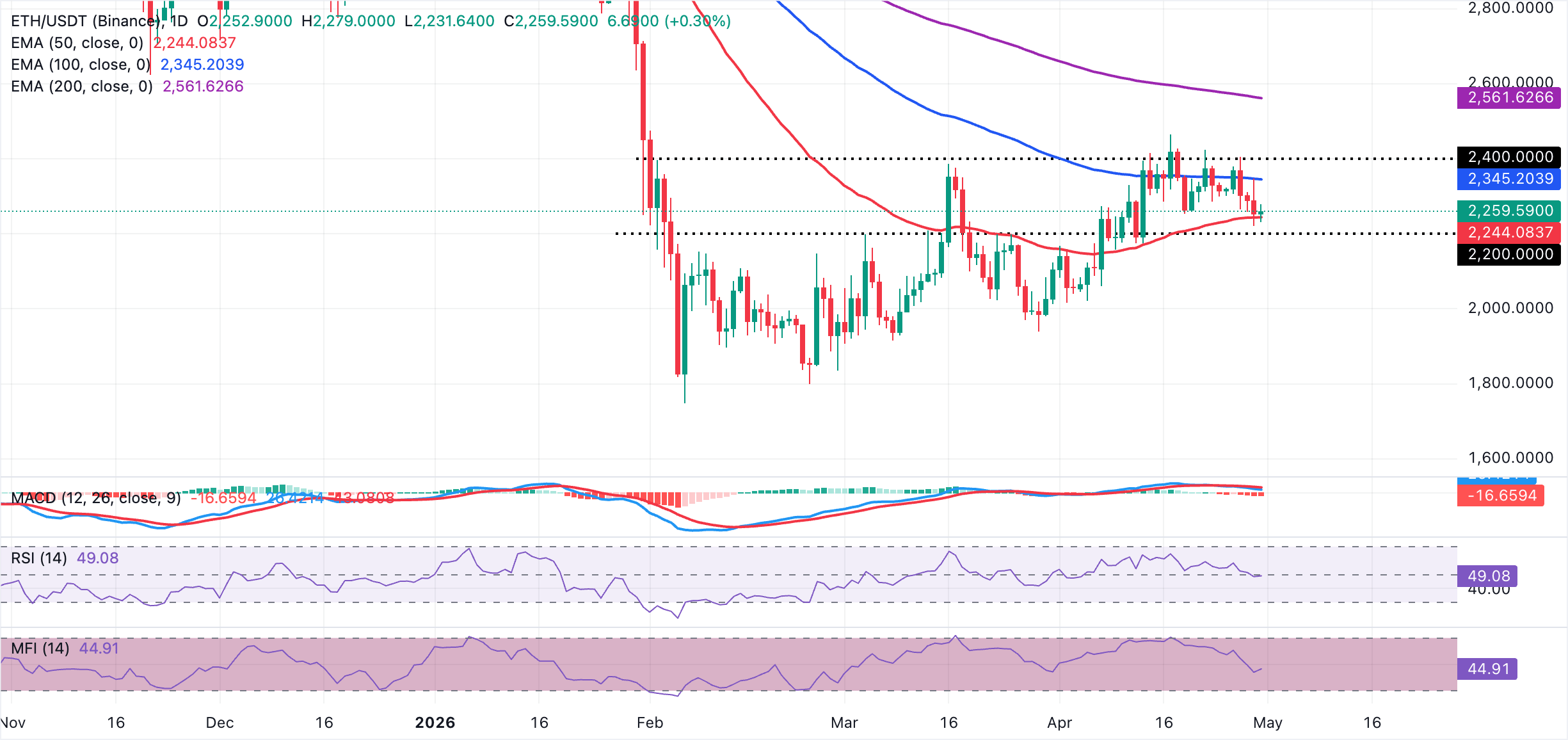 Ethereum giao dịch ở mức 2.259$, duy trì sắc thái bị giới hạn khi giá giữ dưới các EMA 100 ngày và 200 ngày lần lượt khoảng 2.345$ và 2.562$. Token hợp đồng thông minh đang bám sát ngay trên EMA 50 ngày ở mức 2.244$, đóng vai trò là mức hỗ trợ động ngay lập tức, nhưng biểu đồ MACD âm và MFI dưới 50 trên biểu đồ hàng ngày gợi ý các đợt tăng giá đang bị bán ra, trong khi RSI dao động gần vùng trung tính.