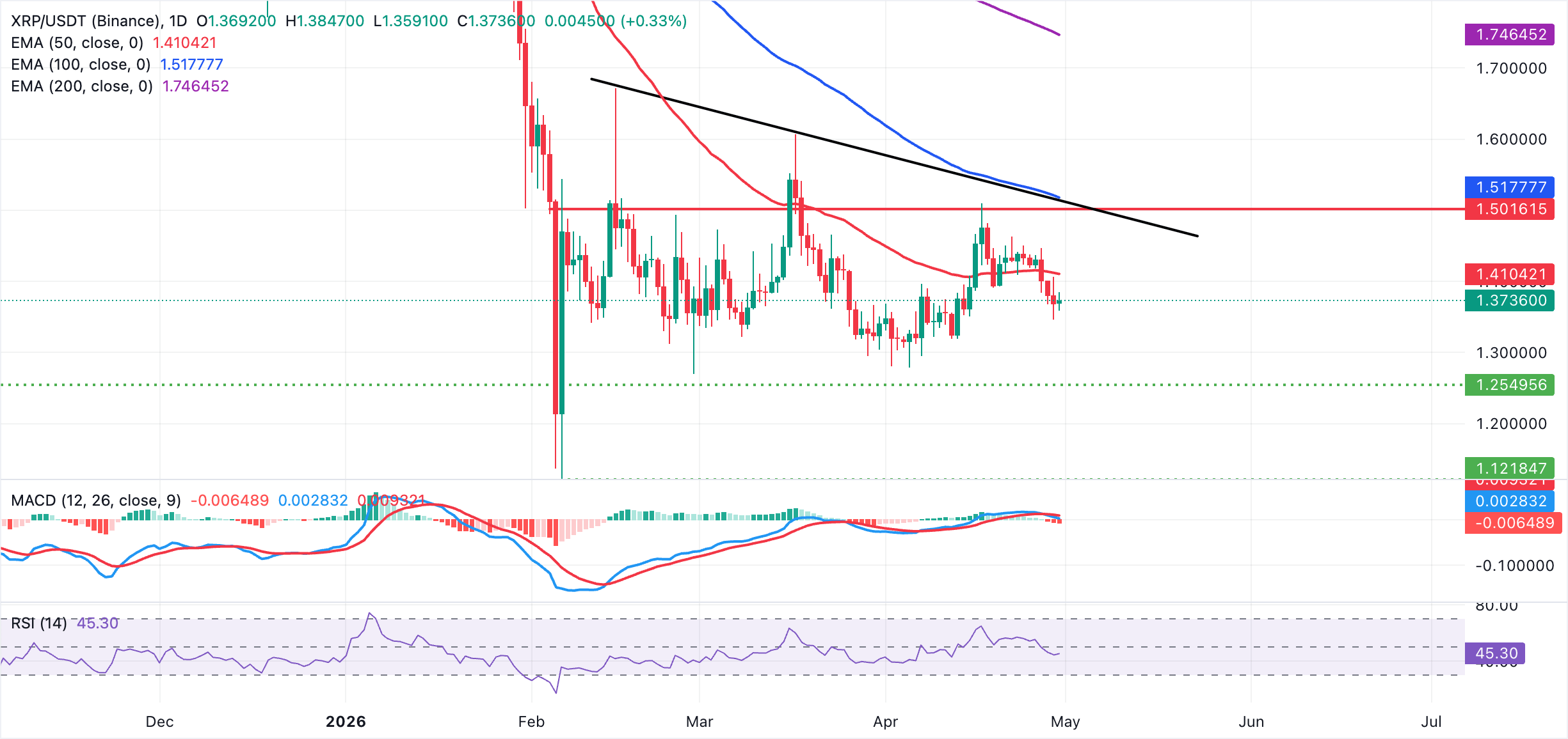 XRP, ngược lại, giao dịch quanh mức 1,37$, duy trì xu hướng giảm ngắn hạn khi giá giữ dưới các EMA 50 ngày, 100 ngày và 200 ngày. Cụm các đường trung bình động này, dẫn đầu bởi EMA 50 ngày tại 1,41$, củng cố nguồn cung phía trên, trong khi đường kháng cự xu hướng giảm rộng hơn, dự kiến từ vùng 1,51$, tạo thêm một giới hạn nữa.