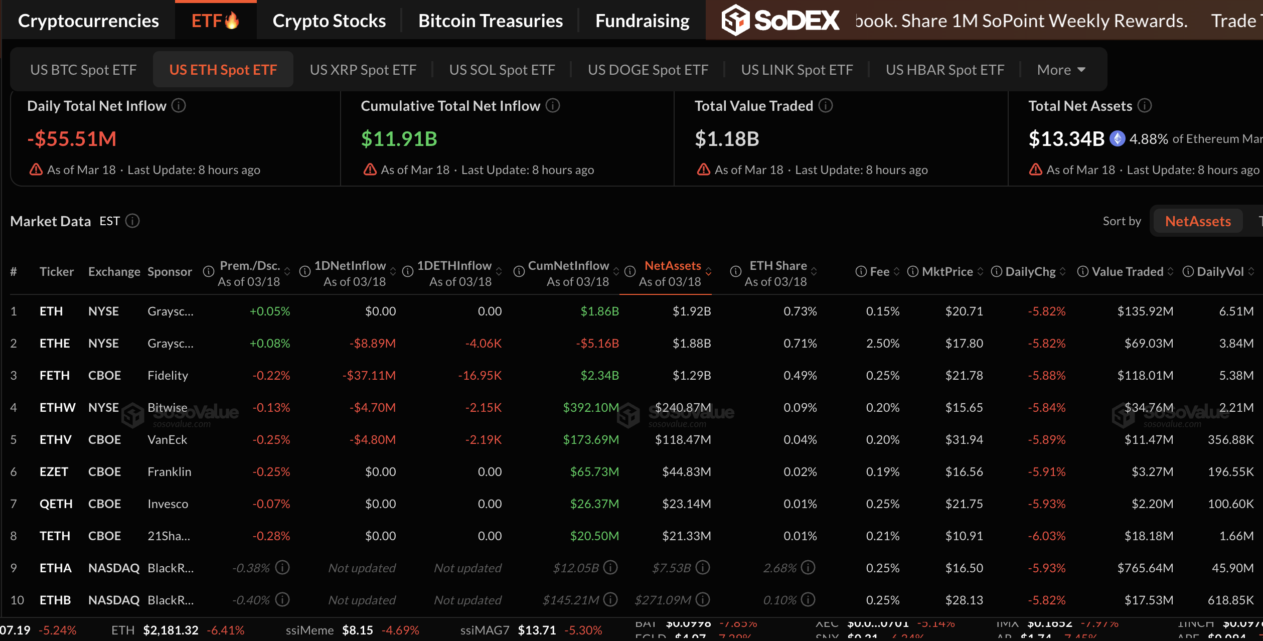 Các quỹ ETF giao ngay Ethereum cũng đảo chiều vào thứ Tư, ghi nhận gần 56 triệu USD dòng vốn chảy ra sau chuỗi 6 ngày liên tiếp có dòng vốn chảy vào. Tổng tài sản ròng được quản lý đạt 11,91 tỷ USD, trong khi tổng dòng vốn đổ vào trung bình là 13,34 tỷ USD.