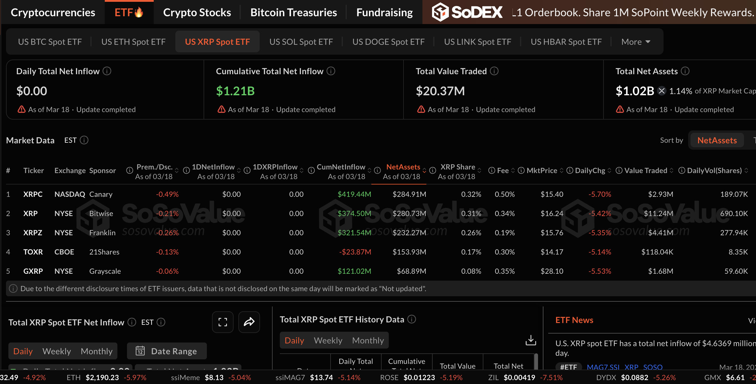 Trong khi đó, hoạt động của các quỹ ETF giao ngay XRP vẫn trầm lắng vào thứ Tư, với không có dòng vốn nào được ghi nhận, theo dữ liệu của SoSoValue. Tổng dòng vốn đổ vào đạt 1,21 tỷ USD với tài sản ròng được quản lý trung bình là 1,02 tỷ USD.