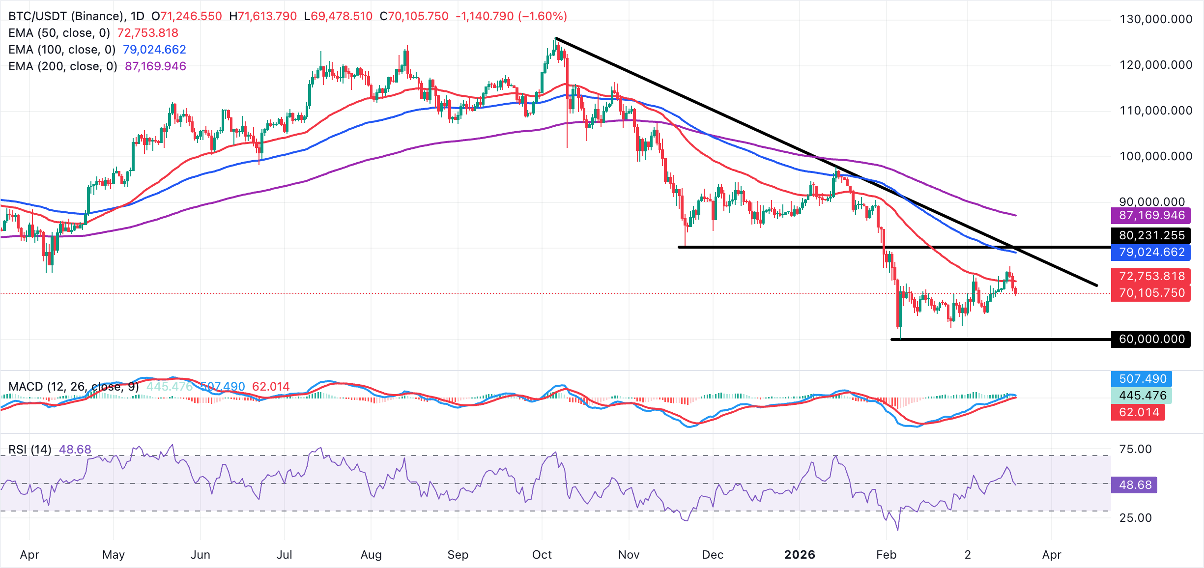 Bitcoin tiếp tục điều chỉnh và giao dịch trên mức quan trọng 70.000 USD, xác nhận triển vọng trung lập đến giảm giá. Giá hiện tại cũng đang giữ dưới các đường trung bình động quan trọng, bao gồm đường trung bình động hàm mũ 50 ngày (EMA), vốn đã đóng vai trò hỗ trợ trong thời gian ngắn vào đầu tuần, đường EMA 100 ngày và đường EMA 200 ngày. Cả ba đường trung bình động này đều dốc xuống, duy trì xu hướng giảm giá tổng thể.
