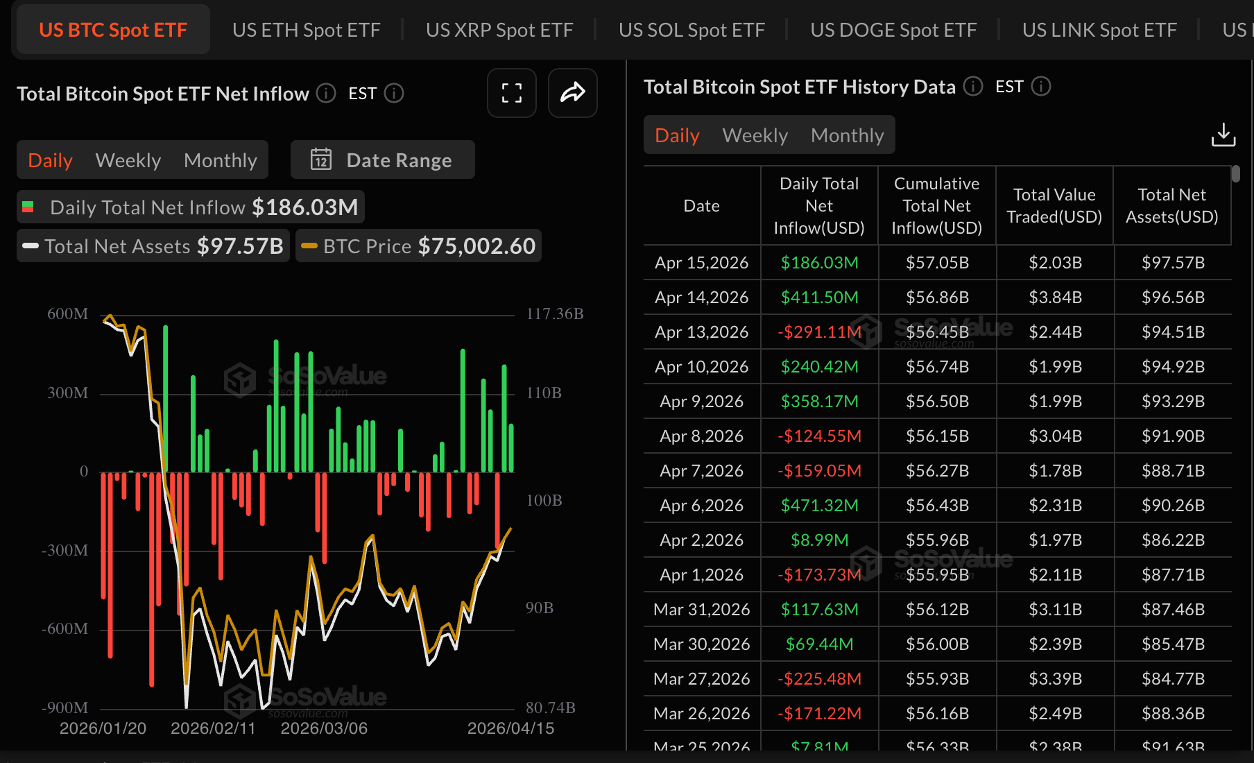 Nhà đầu tư tổ chức dường như đã lấy lại sự quan tâm đối với tài sản tiền điện tử, thể hiện qua các Quỹ giao dịch trao đổi (ETF) Bitcoin giao ngay niêm yết tại Mỹ, với dòng vốn vào khoảng 186 triệu đô la vào thứ Tư. Mặc dù có căng thẳng địa chính trị ở Trung Đông, sự lạc quan về khả năng diễn ra vòng đàm phán hòa bình thứ hai giữa Hoa Kỳ và Iran đang thu hút nhà đầu tư từ bên lề.