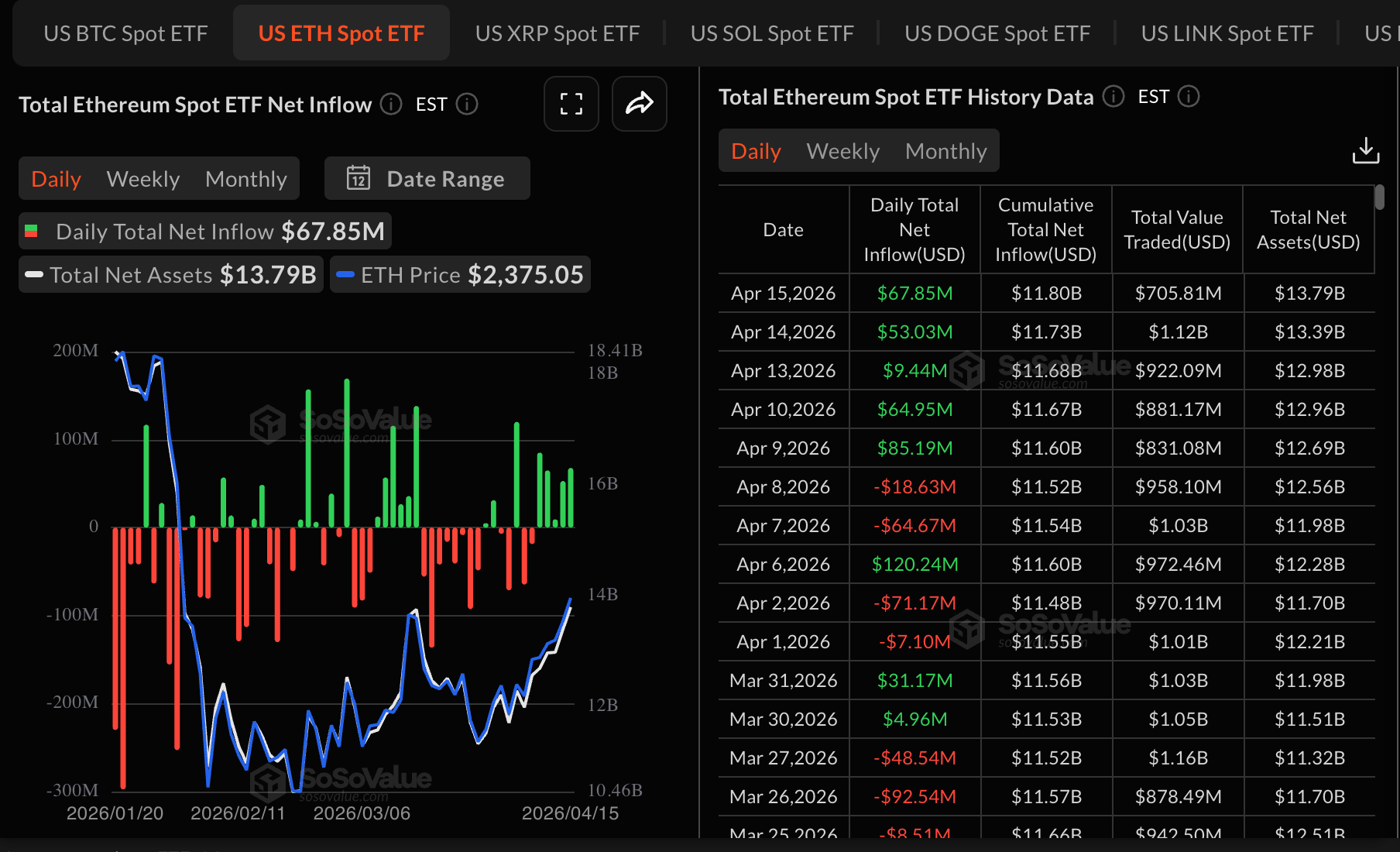 Ethereum cũng ghi nhận dòng vốn vào gần 68 triệu đô la vào thứ Tư, kéo dài chuỗi tăng giá trong năm ngày liên tiếp. Khẩu vị rủi ro của nhà đầu tư được cải thiện đã thúc đẩy dòng vốn tích lũy vào các ETF giao ngay ETH đạt trung bình 11,80 tỷ đô la, trong khi tài sản ròng dưới quản lý hiện ở mức 13,79 tỷ đô la.