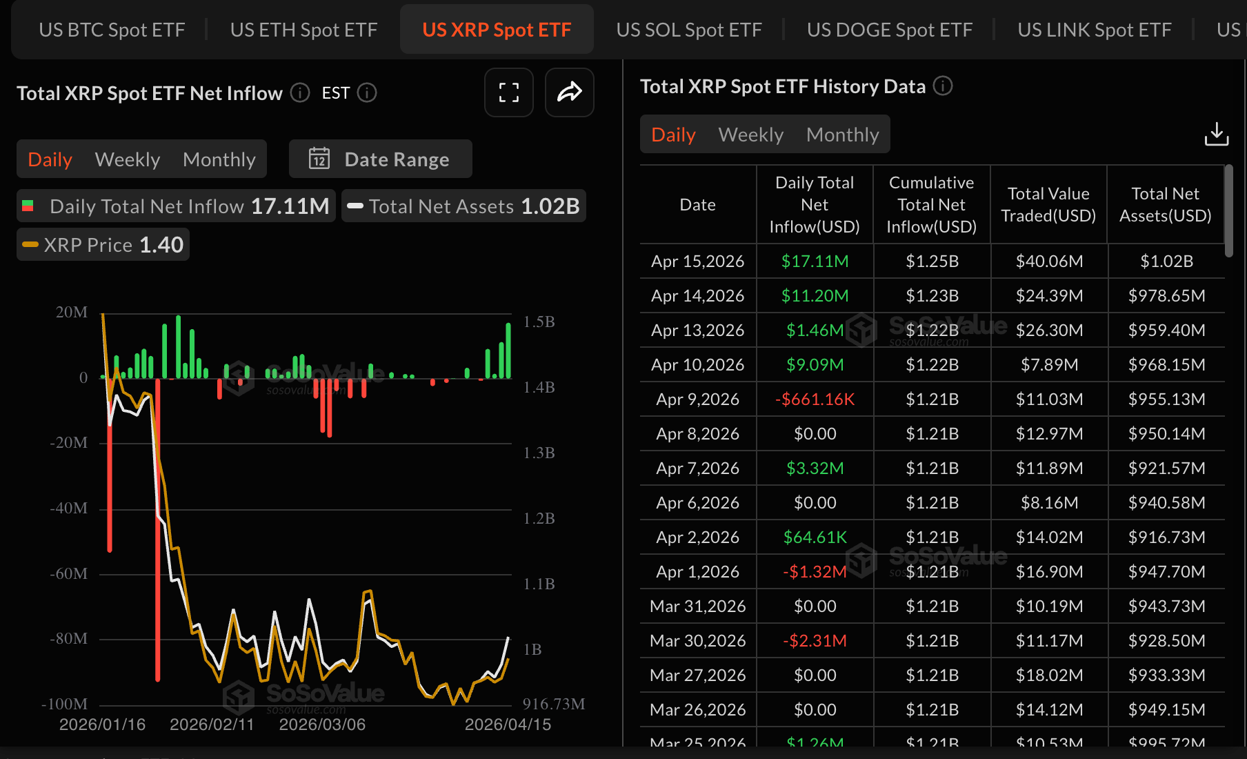 Trong khi đó, nhu cầu đối với các ETF giao ngay XRP tiếp tục theo sát Bitcoin và Ethereum, thể hiện qua dòng vốn mạnh mẽ 17 triệu đô la vào thứ Tư, tăng so với khoảng 11 triệu đô la ngày trước đó. Dòng vốn tích lũy đạt 1,25 tỷ đô la và tài sản ròng dưới quản lý là 1,02 tỷ đô la, cho thấy sự quan tâm ngày càng tăng đối với XRP và các sản phẩm đầu tư liên quan.