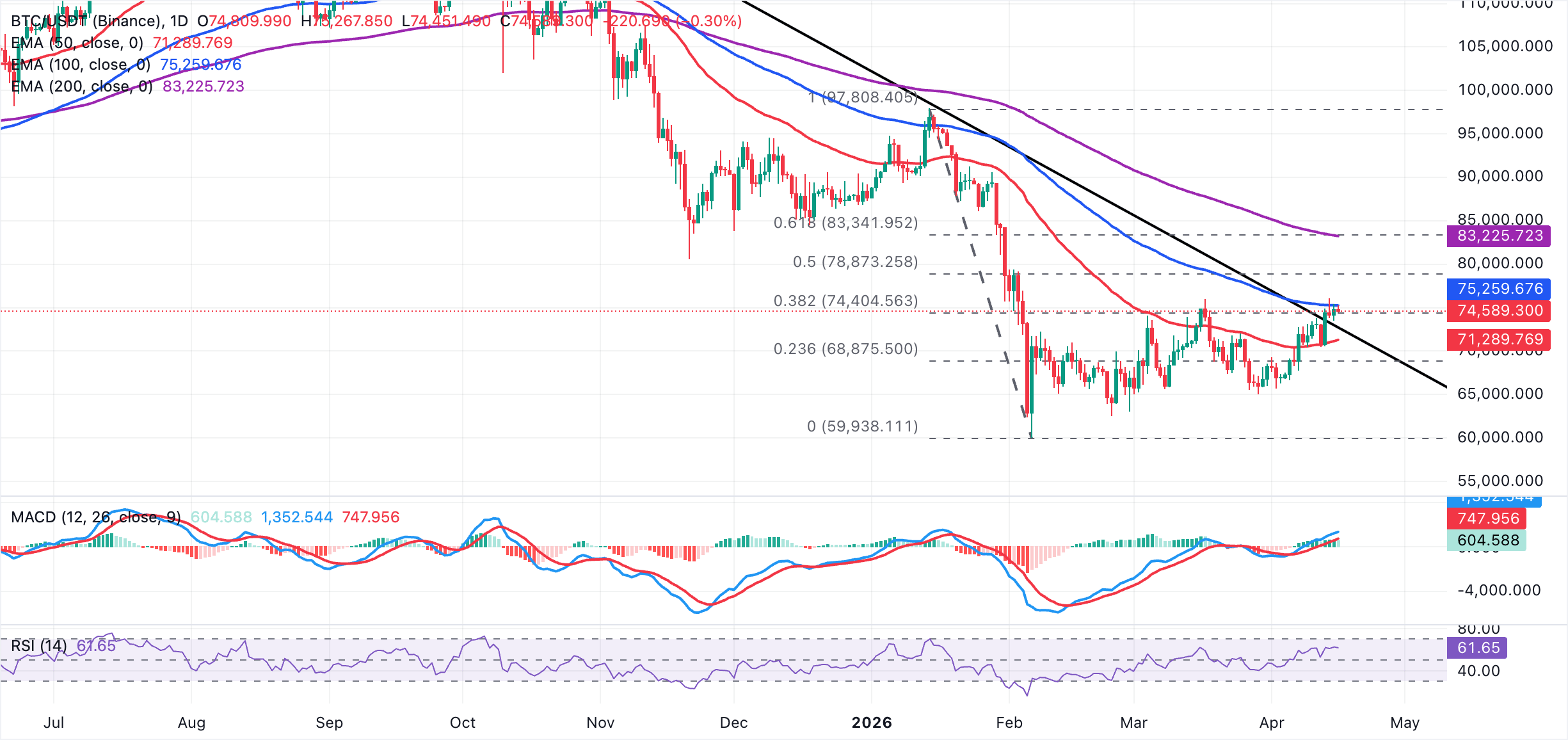 Bitcoin giao dịch ở mức 74.589$, giữ xu hướng tăng ngắn hạn khi giá nằm hơi trên đường trung bình động hàm mũ (EMA) 50 ngày quanh 71.289$ cũng như mức thoái lui Fibonacci 38,2% tại 74.404$, được vẽ giữa đỉnh ngày 14 tháng 1 ở 97.924$ và đáy ngày 6 tháng 2 ở 60.000$.