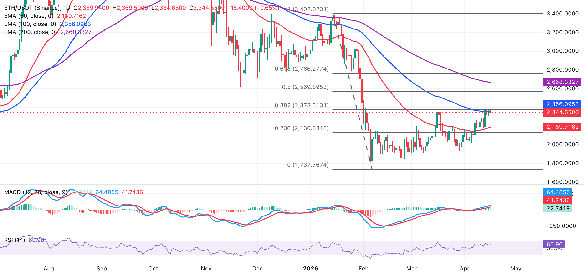 Ethereum giao dịch ở mức 2.344$, giữ sắc thái bị giới hạn khi nằm trên đường EMA 50 ngày tại 2.189$ nhưng vẫn dưới đường EMA 100 ngày ở 2.356$ và EMA 200 ngày tại 2.668$. Cấu hình này cho thấy, mặc dù bối cảnh được cải thiện, xu hướng giảm rộng hơn vẫn chiếm ưu thế.