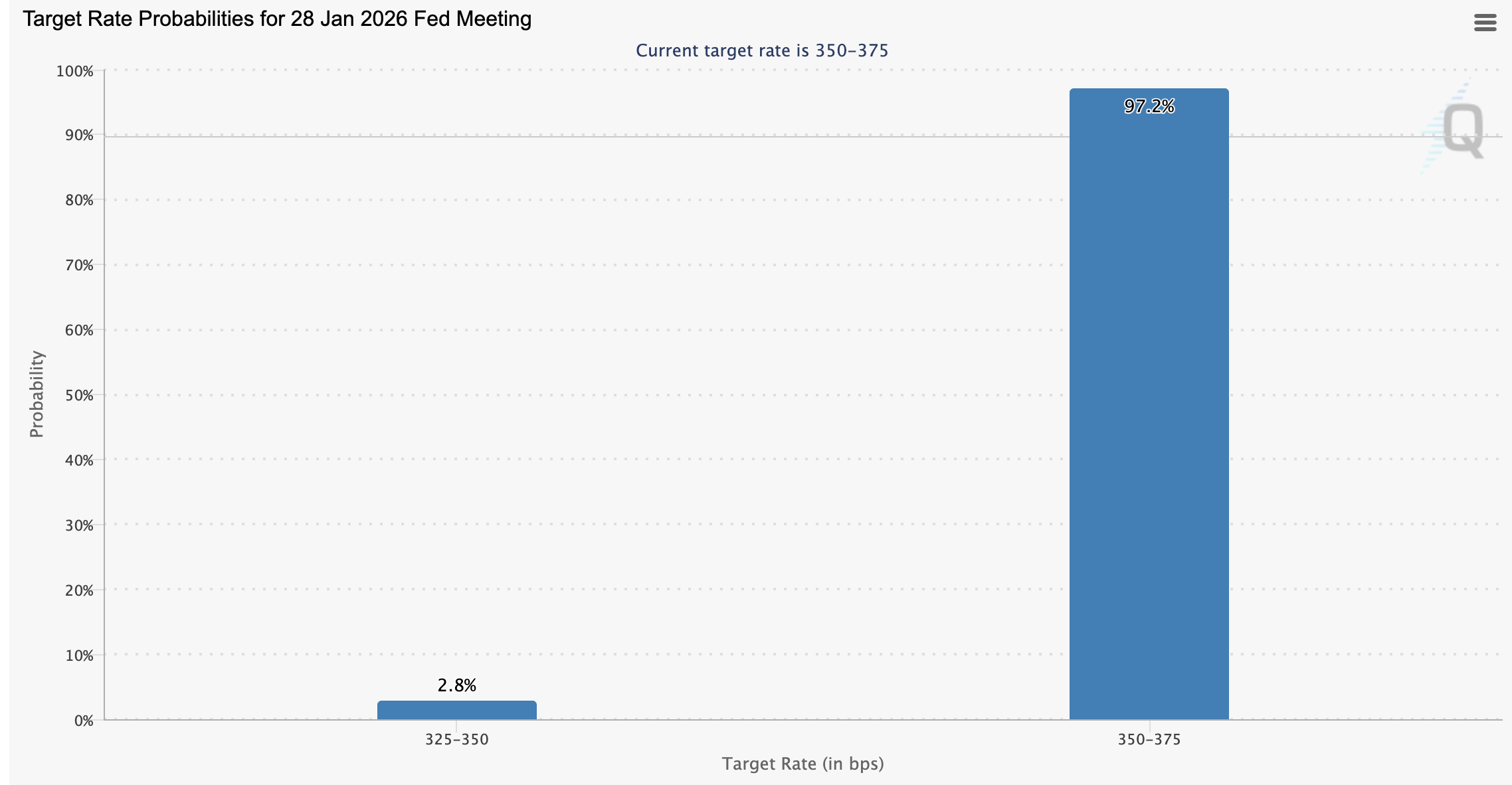 Công cụ FedWatch của CME Group cho thấy các nhà đầu tư tiếp tục dự đoán 97,2% khả năng ngân hàng trung ương sẽ giữ nguyên lãi suất, chỉ có 2,8% người tham gia thị trường kỳ vọng lãi suất sẽ giảm xuống mức 3,25%–3,50%.