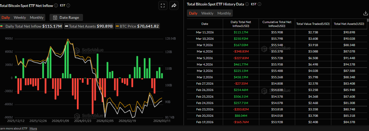 Nhu cầu từ các tổ chức vẫn mạnh mẽ trong tuần này. Theo dữ liệu của SoSoValue, các quỹ ETF Bitcoin giao ngay đã ghi nhận dòng vốn vào 115,17 triệu đô la vào thứ Tư, đánh dấu ngày thứ ba liên tiếp có dòng vốn tích cực trong tuần này. Nếu dòng vốn này tiếp tục và tăng mạnh, BTC có thể phục hồi hơn nữa trong những ngày tới.