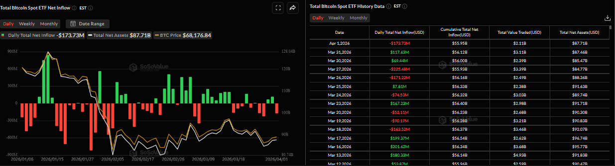 Nhu cầu của các tổ chức đối với Bitcoin cho thấy tâm lý trái chiều trong tuần này. Dữ liệu của SoSoValue cho thấy các quỹ ETF Bitcoin giao ngay đã ghi nhận dòng tiền chảy ra 173,73 triệu đô la vào thứ Tư sau hai ngày dòng tiền tích cực hồi đầu tuần. Điều này làm nổi bật sự thiếu quyết đoán của các nhà đầu tư tổ chức, những người không sẵn sàng tăng mức độ tiếp xúc với các tài sản rủi ro trong bối cảnh thị trường bất ổn hiện nay. BTC đang bị kẹt trong xu hướng đi ngang rộng hơn.