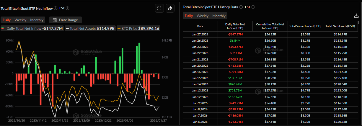 Nhu cầu của các tổ chức đối với Bitcoin báo hiệu thái độ thận trọng của các nhà đầu tư. Dữ liệu của SoSoValue cho thấy các quỹ ETF Bitcoin giao ngay đã ghi nhận dòng vốn chảy ra 147,37 triệu đô la vào thứ Ba, sau khi có dòng vốn chảy vào 6,84 triệu đô la vào ngày hôm trước. Nếu xu hướng dòng vốn chảy ra không liên tục này tiếp tục, nó có thể báo hiệu sự do dự của các nhà đầu tư tổ chức và hạn chế đà tăng giá của Bitcoin.