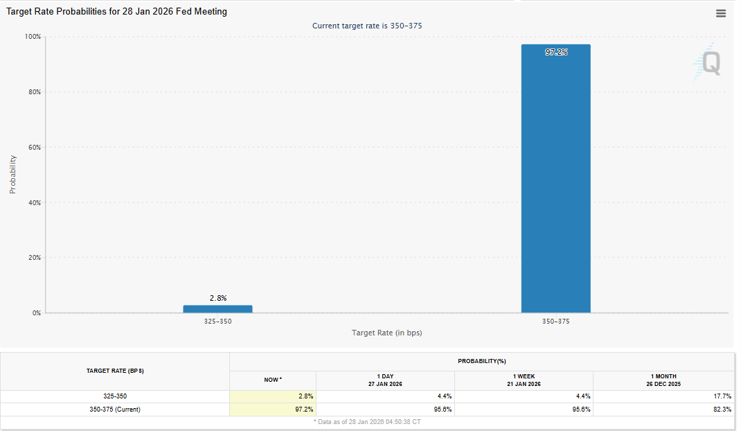 Bitcoin bắt đầu tuần với tín hiệu tích cực, phục hồi gần 3% sau khi điều chỉnh hơn 7% trong tuần trước. Quyết định về lãi suất của Cục Dự trữ Liên bang (Fed) vào thứ Tư tới là một sự kiện quan trọng cần theo dõi. Công cụ CME FedWatch cho thấy có 97,2% khả năng lãi suất sẽ không thay đổi, nằm trong khoảng 3,50%-3,75%. Do đó, trọng tâm sẽ là những bình luận của Chủ tịch Fed Jerome Powell tại cuộc họp báo sau quyết định, nơi mọi bình luận sẽ được xem xét kỹ lưỡng để tìm kiếm manh mối mới về lộ trình lãi suất trong tương lai và bất kỳ sự bất ngờ nào cũng có thể mang lại sự biến động mới cho các tài sản rủi ro, chẳng hạn như Bitcoin.