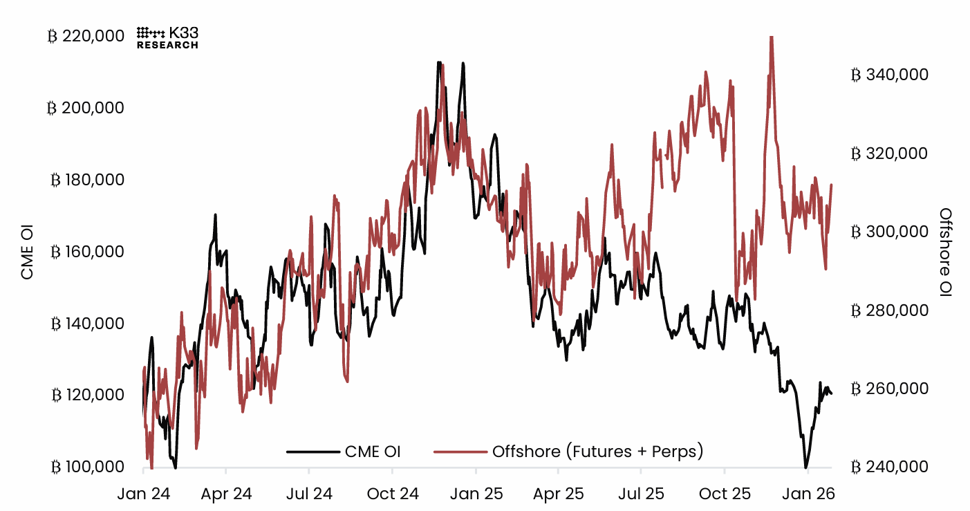 Trong khi cả hai thị trường đều cho thấy sự tham gia giảm sút, Khối lượng giao dịch mở (OI) của CME đã liên tục giảm trong năm qua và giảm khoảng 50% so với mức đỉnh tháng 12 năm 2024, trái ngược với hợp đồng vĩnh cửu nước ngoài, nơi đòn bẩy đã ổn định trên mức thấp đầu năm 2025.