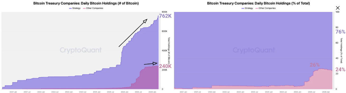 "Do những diễn biến trên, lượng BTC nắm giữ của Strategy đã đạt mức cao kỷ lục mới, trong khi lượng nắm giữ của các công ty khác lại chững lại”, nhà phân tích của CryptoQuant cho biết.