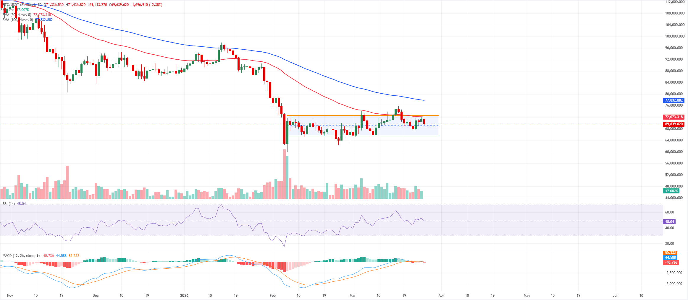 Tính đến thời điểm viết bài này vào thứ Năm, giá Bitcoin đang giao dịch dưới 70.000 đô la. Xu hướng ngắn hạn vẫn hơi giảm khi giá giữ trong một kênh song song, với mức đóng cửa gần nhất nằm dưới ranh giới trên ở mức 72.600 đô la, báo hiệu rằng các đợt tăng giá vẫn bị giới hạn.