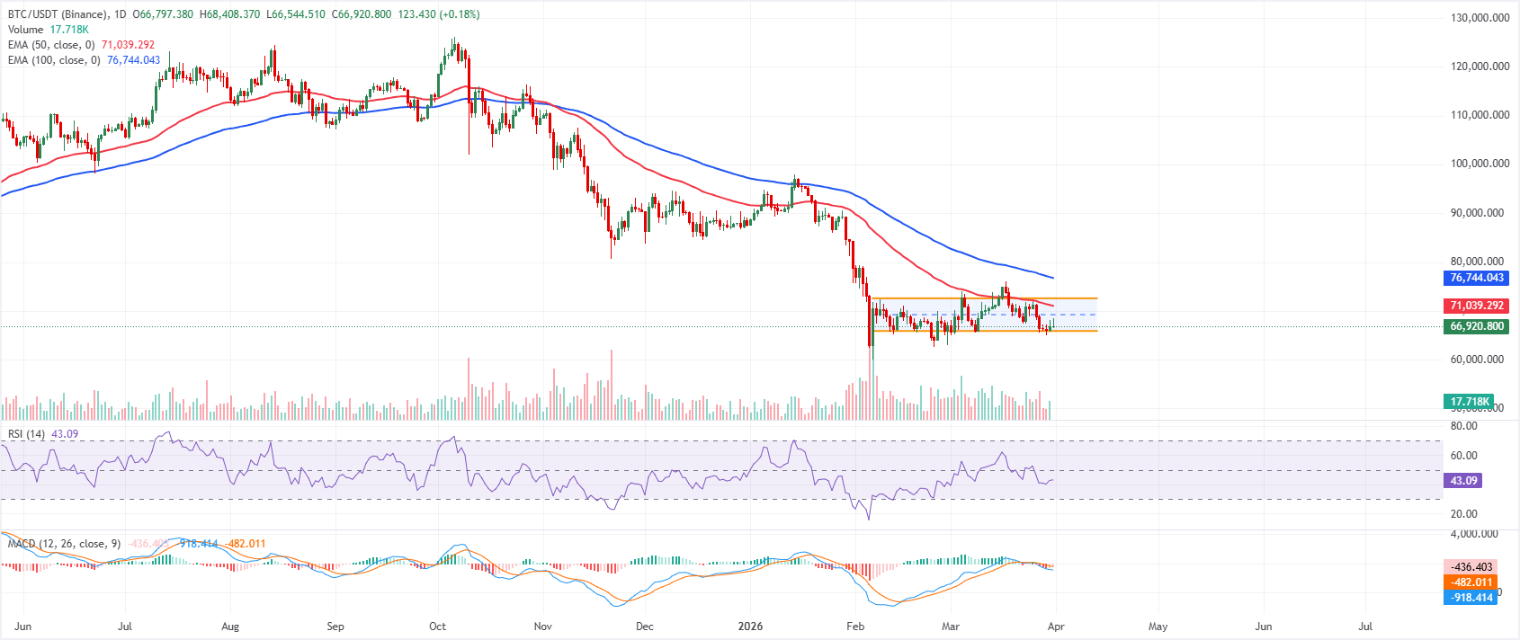 Giá Bitcoin đang giao dịch quanh mức 67.000 đô la vào thứ Ba sau một đợt phục hồi nhẹ, kiểm tra lại ranh giới dưới của một kênh ngang gần mức 65.900 đô la vào ngày hôm trước. Xu hướng ngắn hạn hơi giảm khi giá giữ trong một kênh song song và giao dịch gần ranh giới dưới, tiếp tục duy trì áp lực giảm. Đường trung bình động hàm mũ 50 ngày và 100 ngày quanh mức 71.000 đô la và 76.700 đô la, tương ứng, vẫn cao hơn nhiều so với giá hiện tại, cho thấy một giai đoạn điều chỉnh trong một xu hướng tăng rộng hơn.