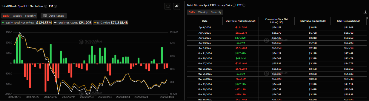 Nhu cầu từ các tổ chức vẫn hỗn hợp với xu hướng giảm nhẹ cho đến nay trong tuần này. Dữ liệu SoSoValue cho thấy các quỹ ETF Bitcoin giao ngay ghi nhận dòng tiền rút ra 124,55 triệu $ vào thứ Tư sau thông báo lệnh ngừng bắn Mỹ-Iran, cho thấy các nhà đầu tư tổ chức không muốn tăng tiếp xúc giữa bối cảnh bất ổn gia tăng. Nếu các dòng tiền rút này tiếp tục và tăng cường, chúng có thể hạn chế đà phục hồi của Bitcoin.