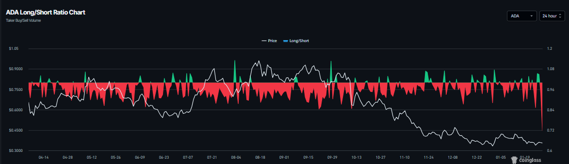 Hơn nữa, dữ liệu phái sinh cũng ủng hộ triển vọng giảm giá đối với Cardano trong ngắn hạn. Tỷ lệ mua/bán khống của CoinGlass đối với ADA là 0,71 vào thứ Năm, mức đặt cược bán khống cao nhất trong hơn một tháng. Tỷ lệ dưới một cho thấy các nhà giao dịch đang đặt cược vào việc giá tài sản sẽ giảm.
