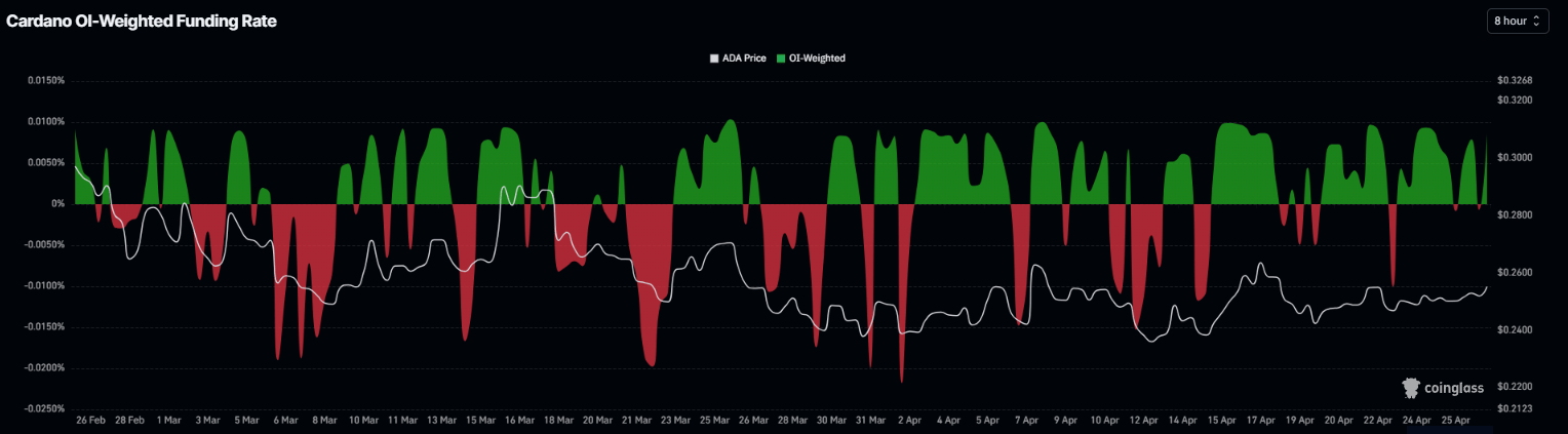 Dữ liệu phái sinh của Cardano cho thấy các tín hiệu trái chiều, hạn chế đà tăng. Dữ liệu Tỷ lệ Tài trợ Có Trọng số OI của CoinGlass cho Cardano đã chuyển sang tích cực vào thứ Hai, ghi nhận 0,0085%, cho thấy các nhà giao dịch vị thế dài đang trả cho vị thế ngắn và gợi ý xu hướng thị trường hơi tăng giá. Tuy nhiên, tỷ lệ tài trợ đã dao động giữa tích cực và tiêu cực kể từ tuần trước, làm nổi bật sự thiếu chắc chắn của nhà giao dịch và cho thấy động lượng tăng giá vẫn chưa có sự xác nhận mạnh mẽ.